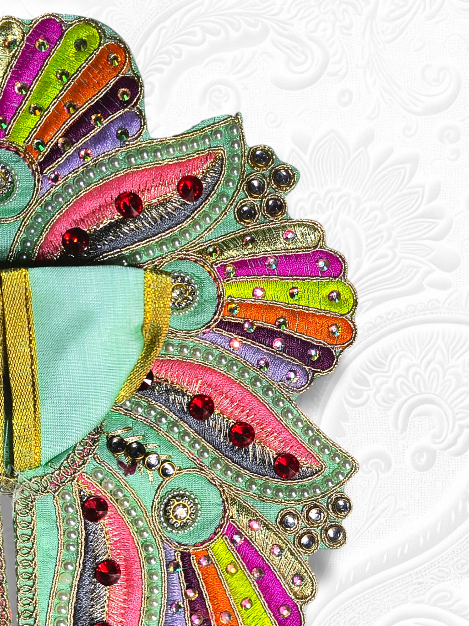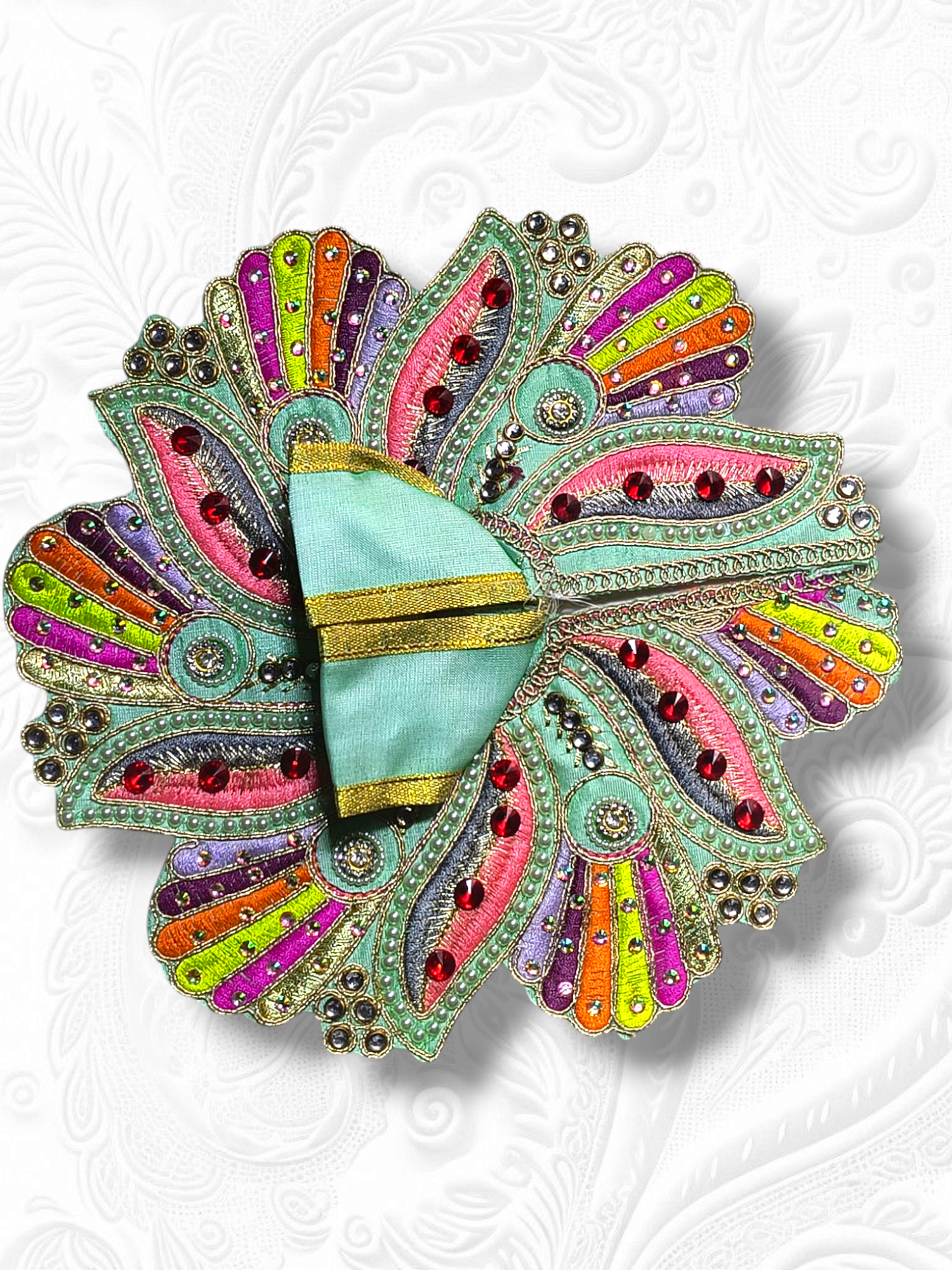 Stone Work Detailing: The poshak is accentuated with carefully hand-applied stone embellishments, which reflect light beautifully, adding a royal and radiant touch to your deity’s appearance.