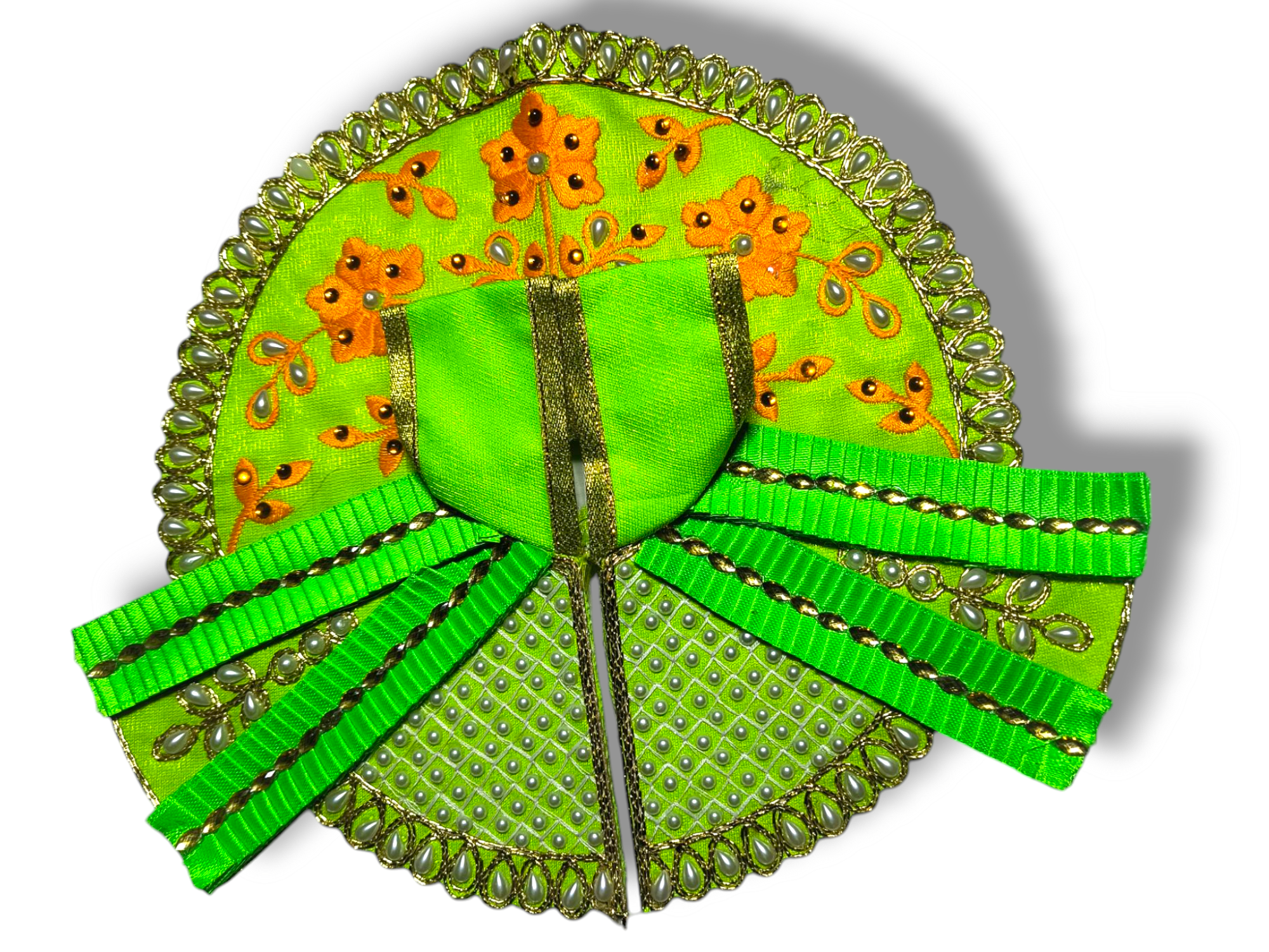 Give your Laddu Gopal Ji a divine and majestic look with this beautifully handcrafted green outfit. Designed with intricate embroidery, pearl embellishments, and a golden border, this dress is perfect for daily worship, festive occasions, and special celebrations.