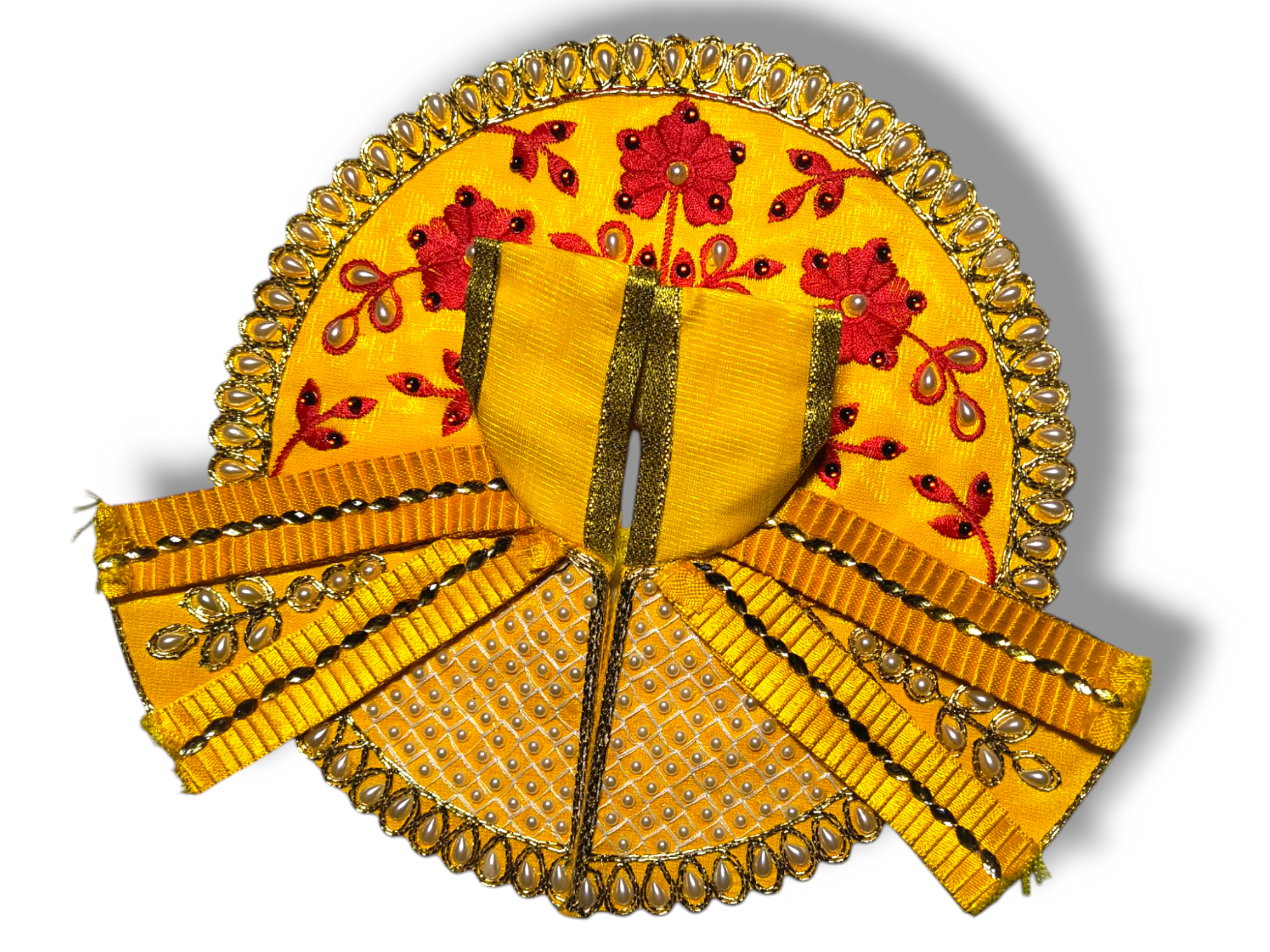 Give your Laddu Gopal Ji a divine and majestic look with this beautifully handcrafted yellow outfit. Designed with intricate embroidery, pearl embellishments, and a golden border, this dress is perfect for daily worship, festive occasions, and special celebrations.