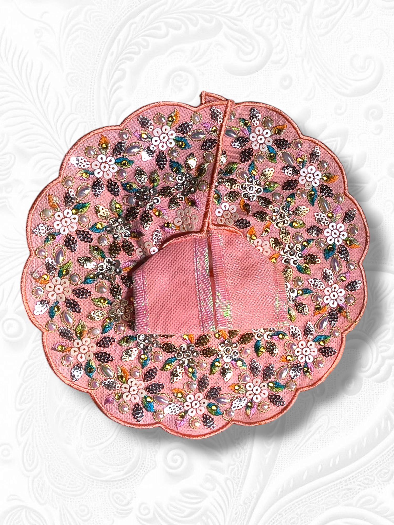 Intricate Heavy Embroidery: The poshak is designed with detailed heavy embroidery, incorporating traditional motifs like peacocks, lotus flowers, and divine symbols. The delicate patterns are skillfully embroidered with golden, silver, and colorful threads, creating a regal and divine aura around your Laddu Gopal Ji.